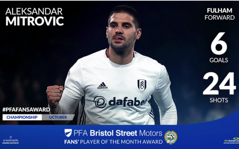 Aleksandar Mitrovic has been voted the PFA Bristol Street Motors Fans Championship Player of the month for October. In a vote run by fan engagement experts, Snack Media, the Fulham forward won with 46% of the vote, beating Leeds United s Kiko Casilla, who