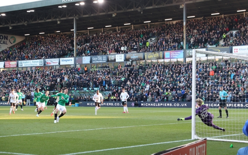 Having scored twice in the win over West Brom, Ryan Hardie stepped up to send Caoimhin Kelleher the wrong way and send the Argyle fans into raptures at the possibility of an upset.